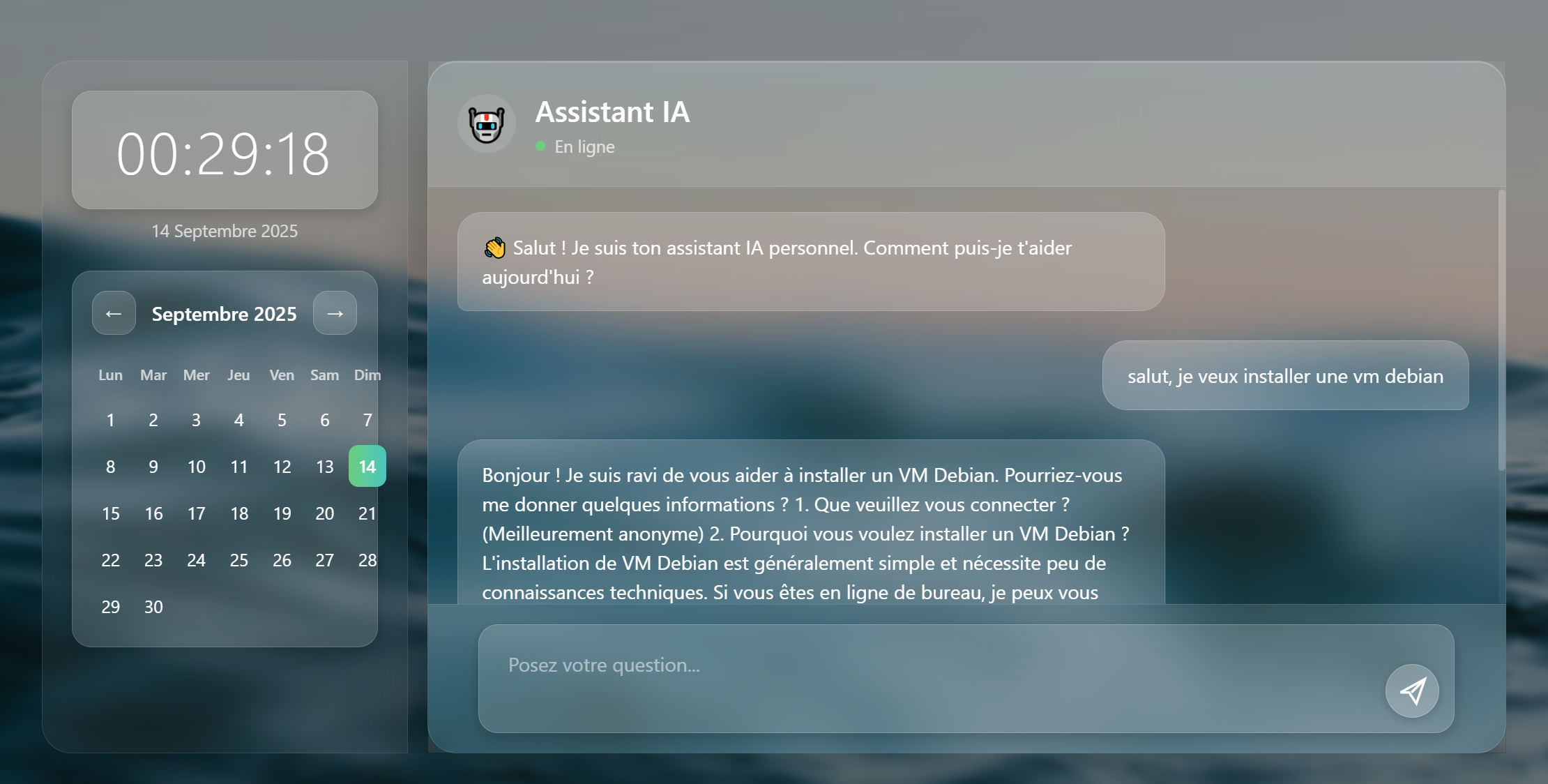 L'utilisateur peut interagir et discuter avec une intelligence artificielle qui marche en local à travers la page web (Qwen).