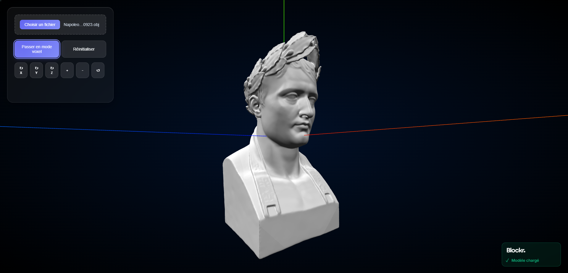Application web utilisant Three.js et permettant à l'utilisateur d'interagir dans un environnement en 3D pour convertir des fichiers 3D en structures de blocs.